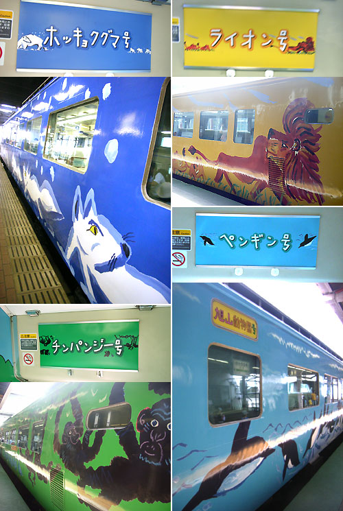 電車は4両編成です。先頭から[ホッキョクグマ号][ライオン号][チンパンジー号][ペンギン号]でしたよ。^^ カワイイ電車でしょ。^^